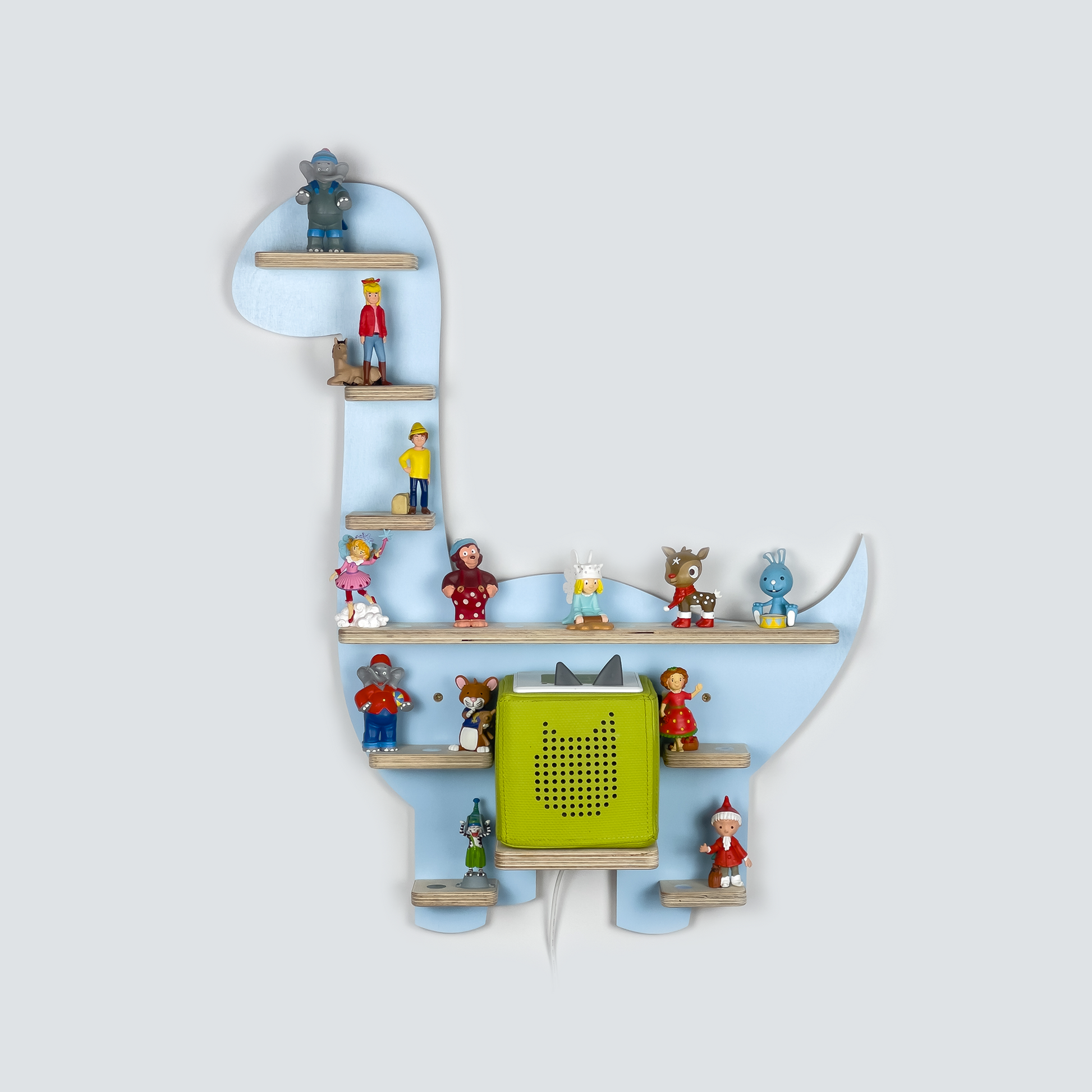 Mit unserem Regal im Dino Design für die Toniefiguren helfen wir Ihnen, Ordnung ins Kinderzimmer zu bringen.